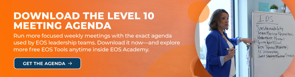 Are you a business coach or entrepreneurial leader ready to guide others? The Level 10 Meeting Agenda isn’t just a tool—it’s part of a proven framework for business growth. Join the ranks of EOS Implementers and use EOS tools to spark clarity, accountability, and meaningful transformation. Learn how to become an EOS Implementer now.