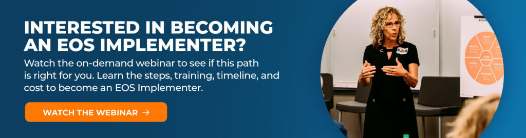 If you do those things consistently, the numbers will take care of themselves, and you’ll build not just a successful EOS practice, but one you’re proud to sustain for the long haul. Building an EOS practice takes patience, professionalism, and a commitment to doing the fundamentals well. For those willing to get the reps, nurture relationships, and play the long game, the EOS Implementer path may be a fit. Learn more about the training and support behind the journey by watching the on-demand webinar or scheduling a discovery conversation with our team.