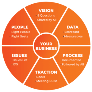 The EOS Model®: Every business is comprised of Six Key Components™ as depicted by the EOS Model. Those six components are: Vision, People, Data, Issues, Process, Traction®. These must be managed and strengthened to create a healthy, well-run business.